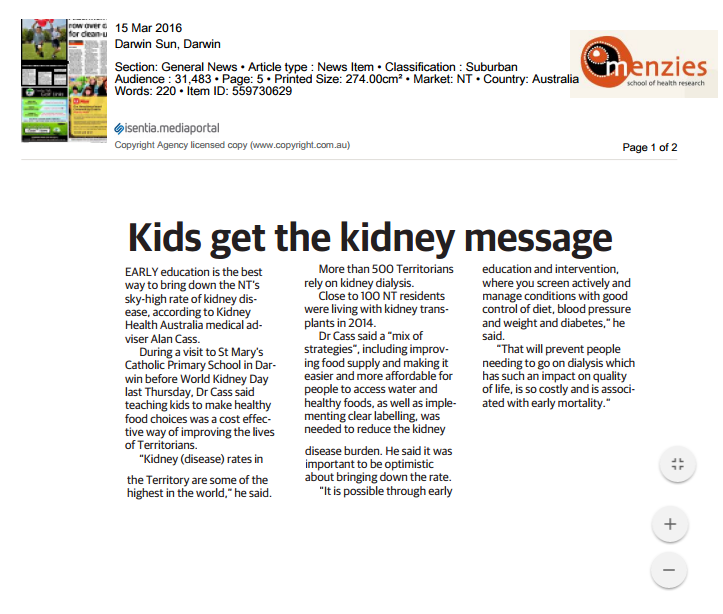 1. Condon JR, Zhang X, Dempsey K, Garling L, Guthridge S. (2016) Trends in cancer incidence and survival for Indigenous and non-Indigenous people in the Northern Territory. Medical Journal of Australia;205(10):454-458. 2. Coffey P, Con...