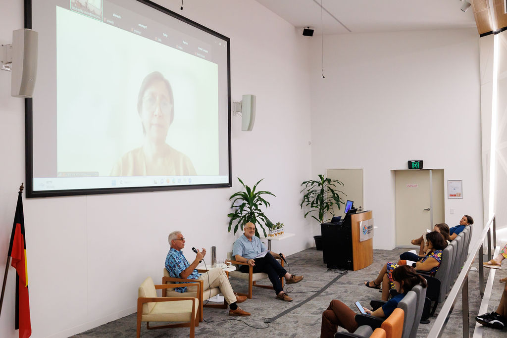 Dr Rini Poespoprodjo (online, Papuan Health & Community Development Foundation) and Prof Nick Anstey (Menzies) discuss the Timika-Menzies Research Collaboration with Prof Alan Cass.