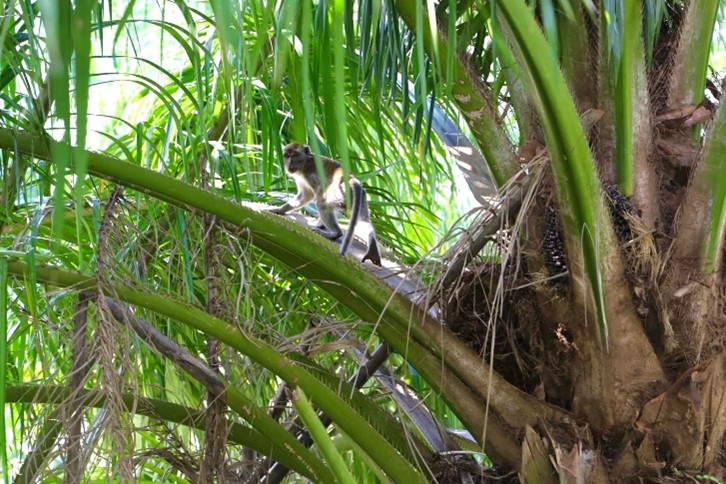 Image 3 (right): A Macaque monkey traversing large oil palms in North Sumatra.