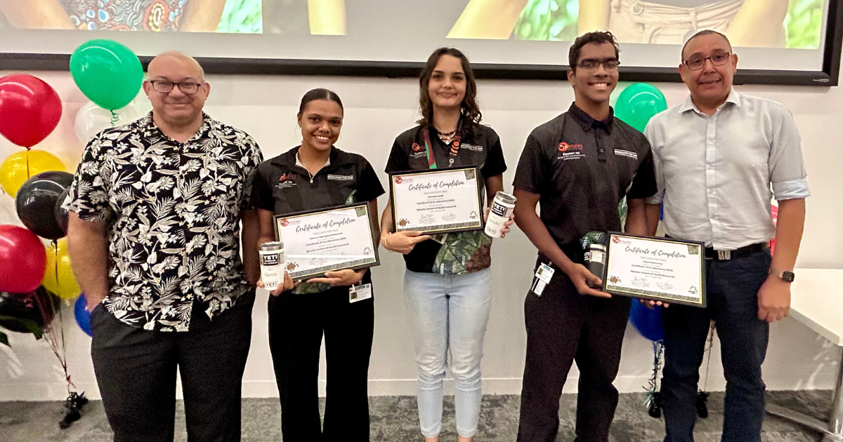Image 1: Menzies-Ramaciotti Centre co-lead, Associate Deputy Director for Indigenous Leadership and Engagement and Senior Researcher - Mark Mayo, (far left) and Menzies’s Deputy Director Indigenous Leadership and Engagement - Dr Sean Taylor (far right), present the graduates with their certificates: (L-R) Porsche Cahill, Shenea Tipungwuti-Edwards and Royce Ramsamy.