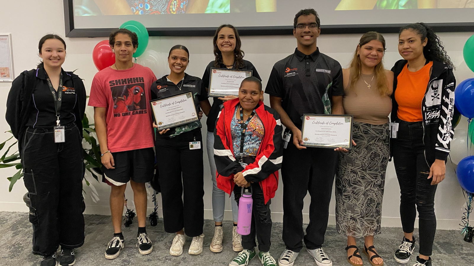Image 4: The Menzies Biyamarr ma Traineeship Program graduates celebrate with current students, alumni and peer mentors. L-R: Lucy Mayo, Henrique Thomas, Shenea Tipungwuti-Edwards, Porsche Cahill, Peggy Tom, Royce Ramsamy, Jaylene Friel and Helena Warria.