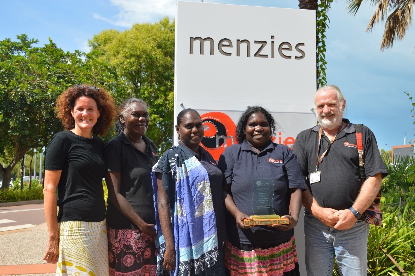 Image 4: Ryan Family Prize winners (centre), Maggie Kerinaiua, Aileen Tiparui and Kaylene Puruntatameri from the Menzies Centre for Child Development and Education (CCDE) – Play to Connect team. The team is pictured at the Menzies Darwin Office with Carolin Stock and Professor Gary Robinson who nominated the team for the award.