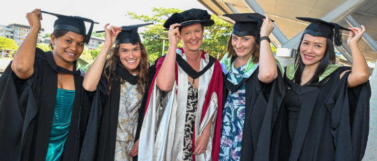 Image 2 (L-R): Ruth Canty (Master of Public Health), Dr Josie Povey (PhD Graduate), Isobel Walker (Graduate Diploma of Health Research), Panadda Duangpanya (Graduate Diploma of Public Health) and Merita Monteiro (Master of Public Health).