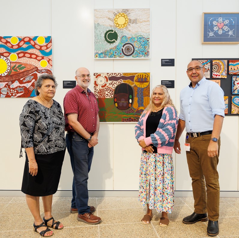 Image 3: Menzies Biyamarr ma Project Officer, Diane Walker; Menzies Director, Prof. Alan Cass; artist, Norma Chidanpee Benger, and Menzies Deputy Director Indigenous Leadership and Engagement, Dr Sean Taylor. The artwork by Norma was commissioned to represent Menzies Reconciliation Action Plan (middle centre) and Menzies Aboriginal and Torres Strait Islander Employment and Career Development Strategy, 2022 – 2027 (middle top).