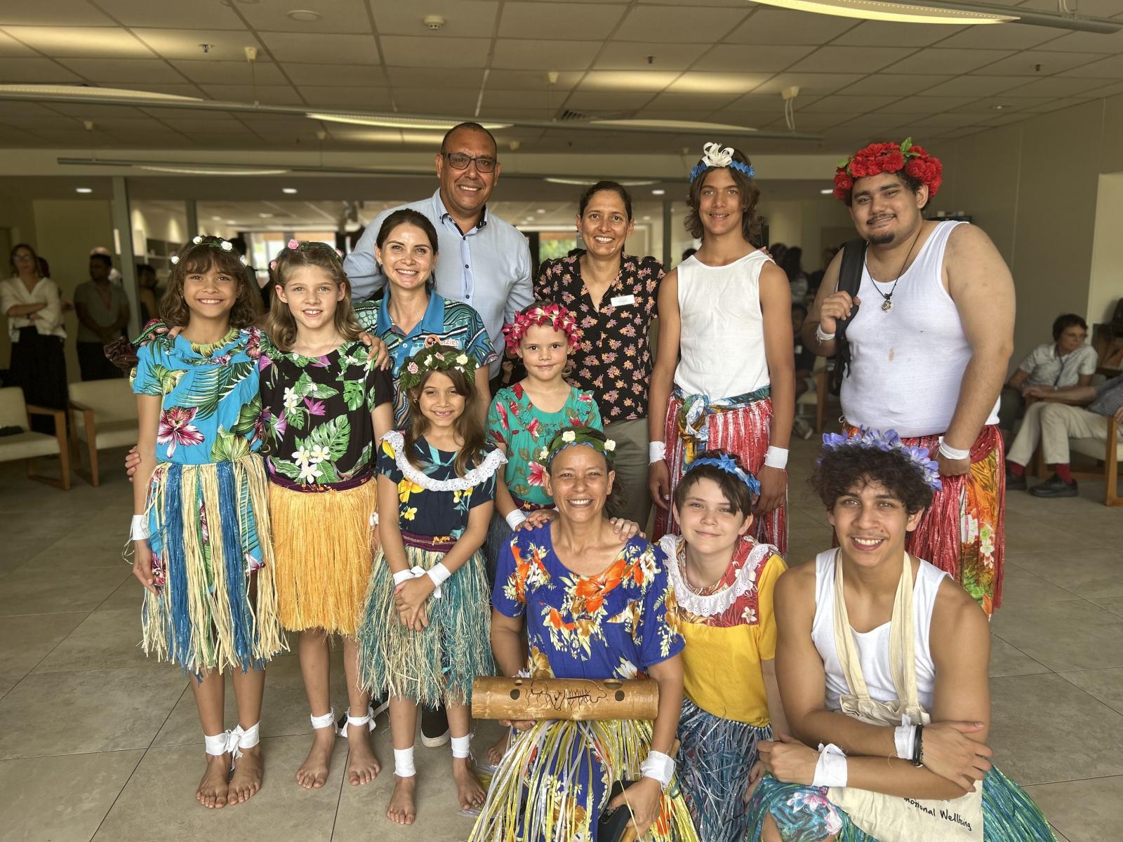 Image 6: The Upai Purri Torres Strait Islander dance troop, with Menzies Deputy Director Indigenous Leadership and Engagement, Dr Sean Taylor, and Menzies team members.