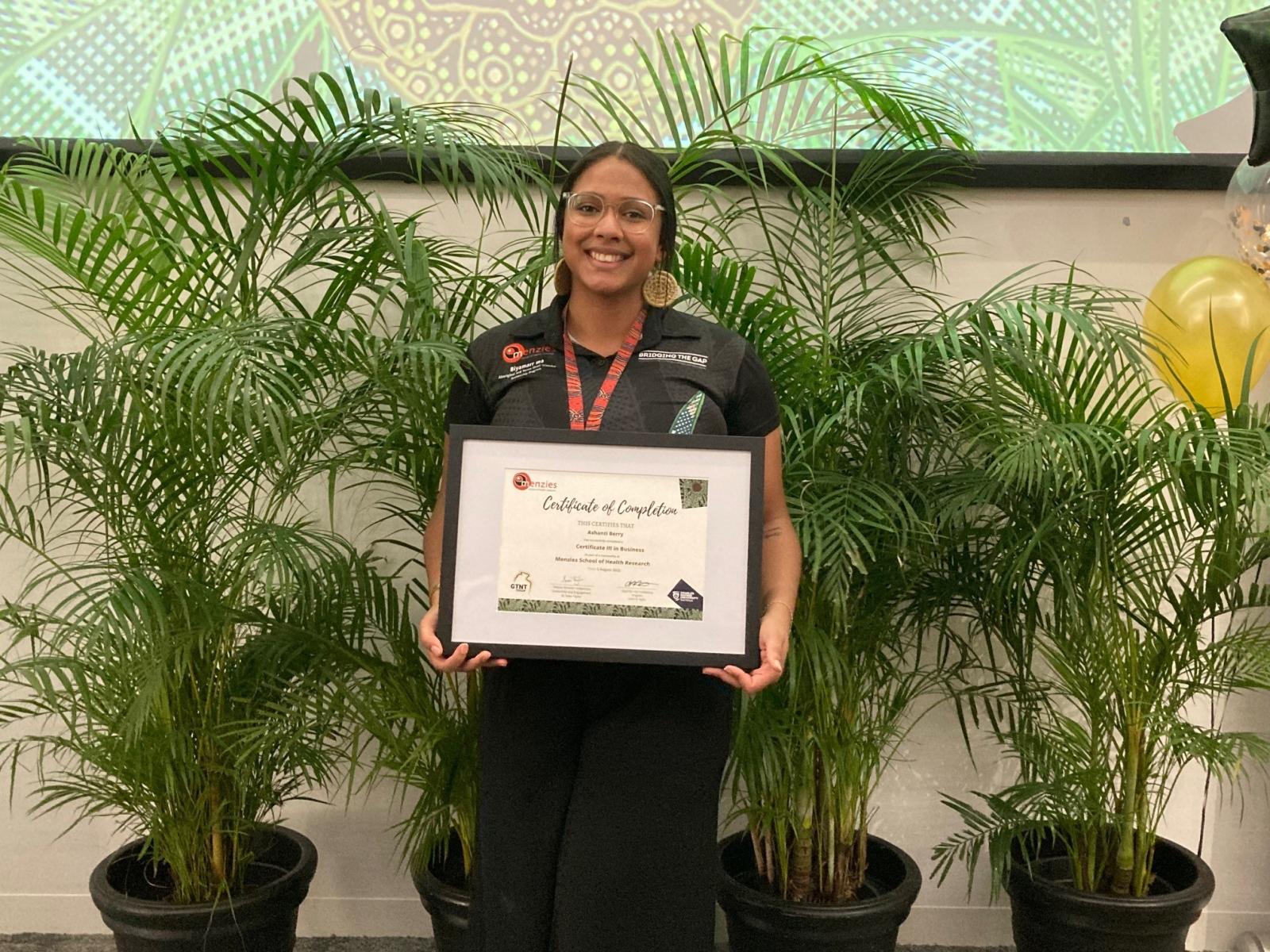 Image 1: Biyamarr ma Traineeship Program Graduate, Ashanti Berry with her Certificate III in Business.