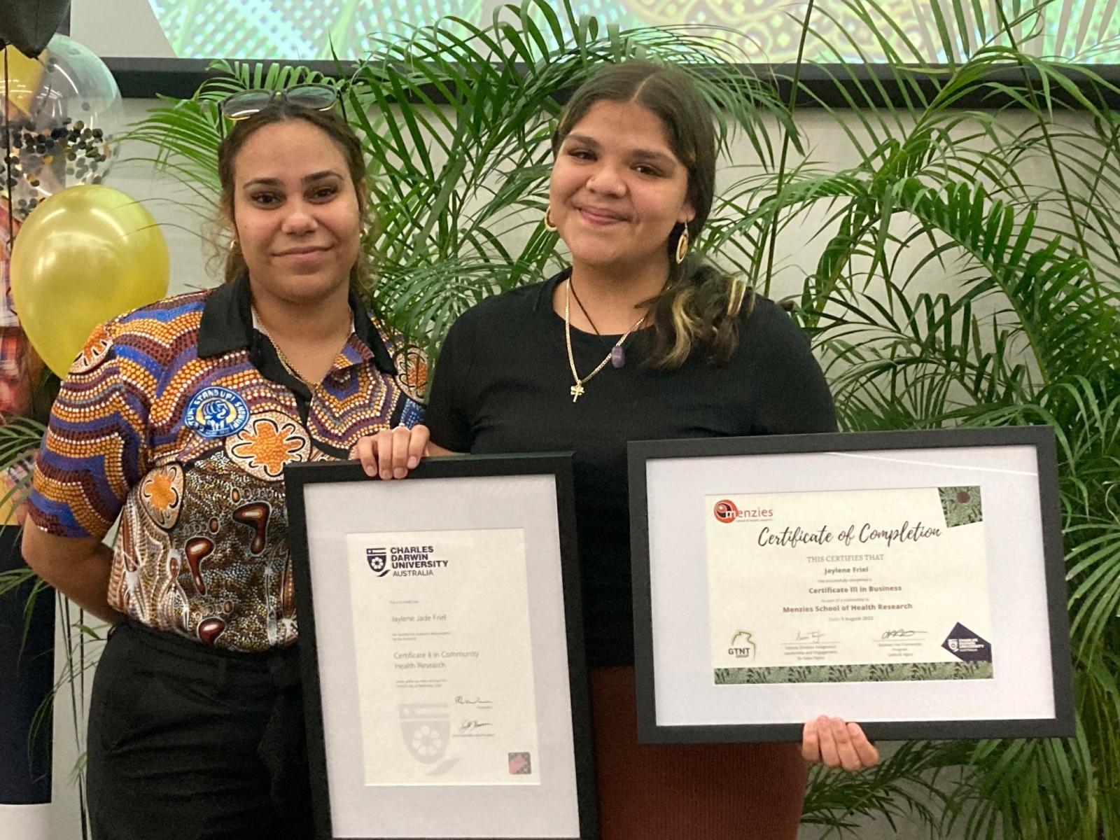 Image 2: Menzies Aboriginal Trainer and Assessor, Clarissa Carter and Biyamarr ma Traineeship Program Graduate, Jaylene Friel with her Certificate III in Business and Certificate II in Community Health Research.
