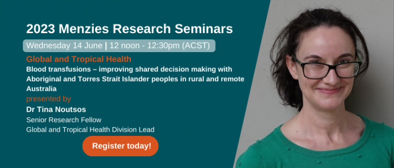 Hear from our Global and Tropical Health Division Lead and Senior Research Fellow, Dr Tina Noutsos who will present: Blood transfusions – improving shared decision making with Aboriginal and Torres Strait Islander peoples in rural and remote Australia.