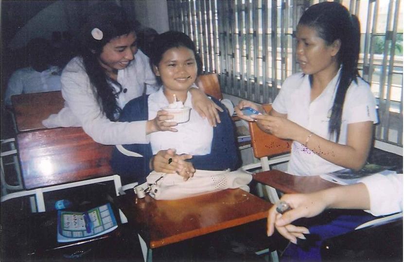These girls are having a small party at school. Cambodian people don’t have birthday parties; this is foreigner culture. She is really happy with her friends for the birthday party. She can’t afford a big cake.