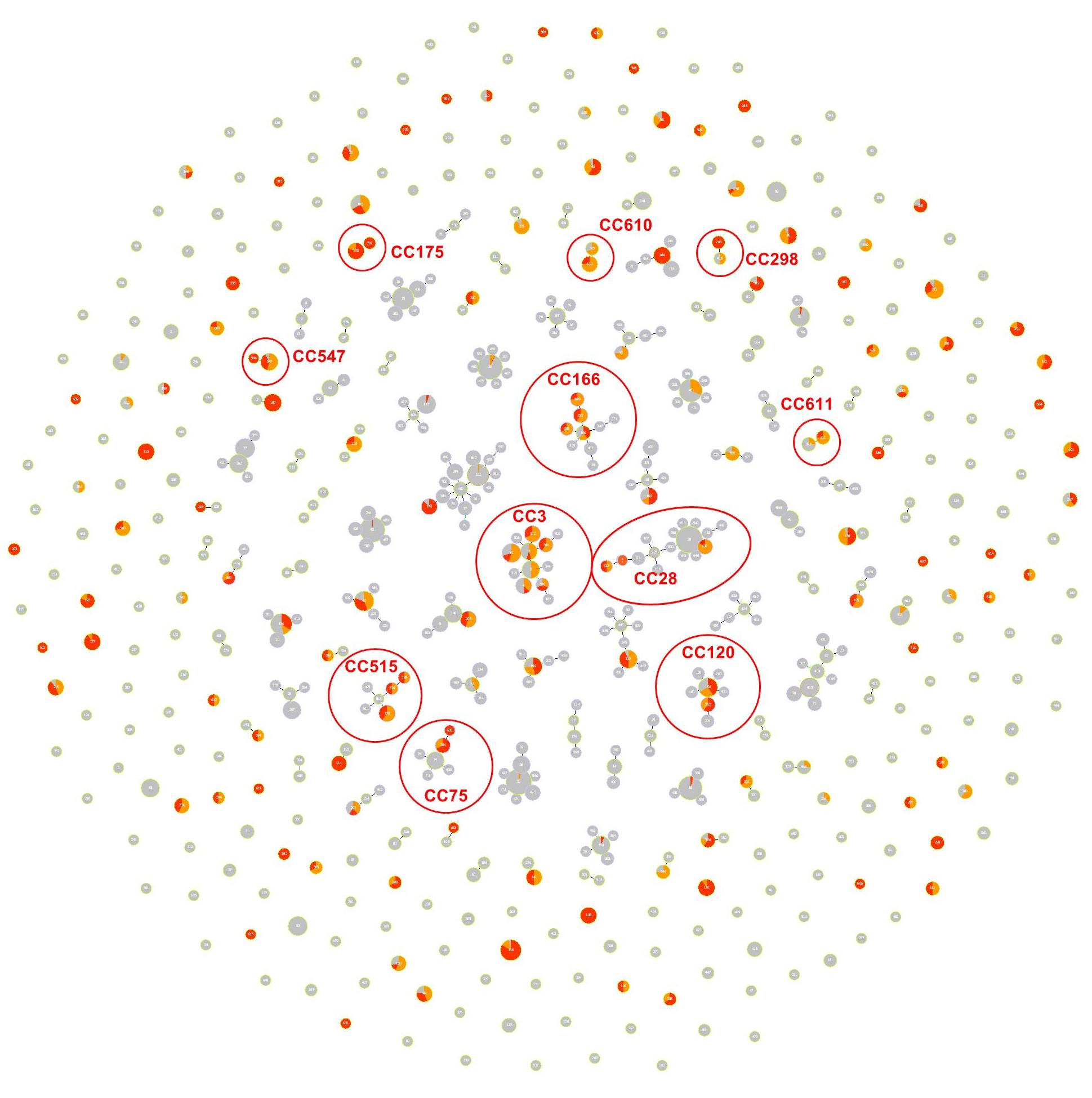 Global population structure of Streptococcus pyogenes: Coloured areas represent genetic types found in the NT, and grey areas represent genetic types found elsewhere in the world.