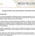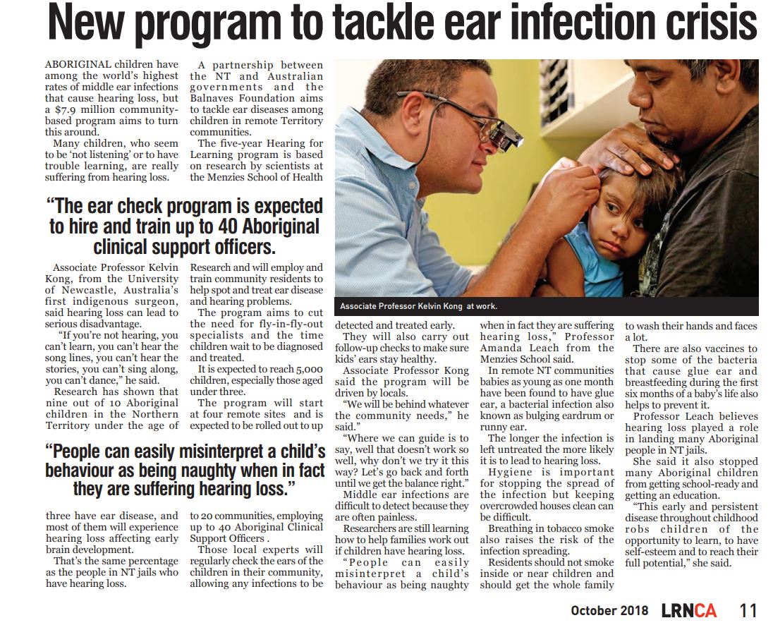 Prof Leach is Joint Chair with Professor Kelvin Kong, for the 5-year Hearing for Learning Initiative – a funding partnership between The Balnaves Foundation, the Northern Territory Government, and the Australian Government. The goal of this stepped-wedge cluster randomised trial of accredited and skills training and employment in 20 communities is to establish local, sustainable, clinical and education expertise to support elimination of social and educational disadvantage caused by ear disease and hearing loss.