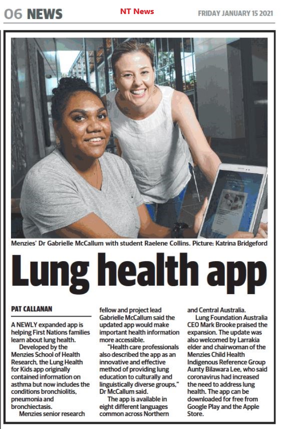 A/Prof McCallum’s passion for improving respiratory education led to developing and evaluating the first, First-Nations-specific educational flipcharts for common childhood respiratory conditions (bronchiolitis, pneumonia, bronchiectasis and asthma) that have been adapted to a multi-lingual mobile application “Lung Health for Kids”.