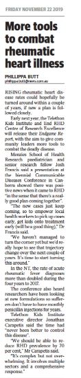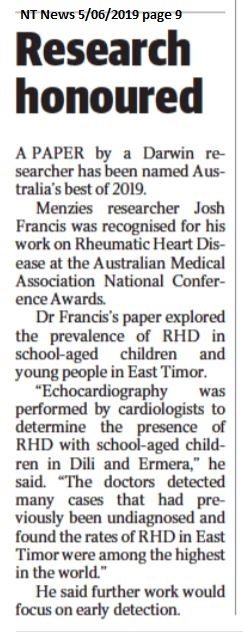 Prof Francis is the chief investigator on the Indo-Pacific Centre for Health Security funded STRONG TL project, delivered by Menzies in partnership with the Ministry of Health in Timor-Leste, to improve communicable disease surveillance and control; the Fleming Fund Country Grant for Timor-Leste, building capacity for antimicrobial resistance surveillance in Timor-Leste; and rheumatic heart diseases projects (NEARER SCAN and NEARER ECHO, and earlier projects Pedrino and RECARDINA) which have engaged remote communities in the Northern Territory and Timor-Leste to tackle rheumatic heart disease through active case finding and community awareness initiatives.