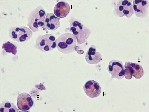 Cytoslides of bronchoalveolar lavage showing airway eosinophilia (E) with neutrophilia