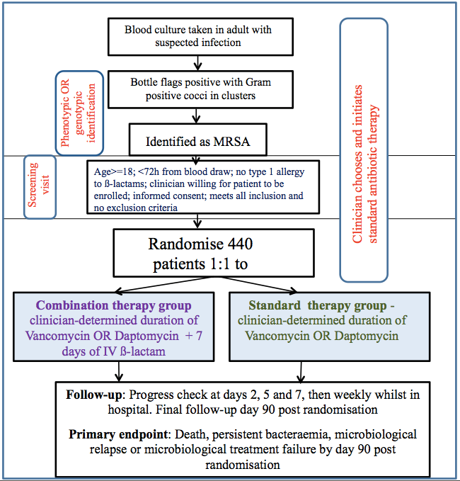 Consented participants were randomised on day 1 to receive standard therapy alone, or standard therapy plus 7 days of IV β-lactam. Data was captured from randomisation (day 1) until 90 days post randomisation from the participant’s medical records and medication charts (electronic and paper). Whilst the participant remained an inpatient, their medical records were reviewed at least weekly until discharge or the 90 day time point whichever occurred first. Information collected includes blood test results (FBC, EUC, LFTs, CRP, blood cultures and vancomycin levels), relevant comorbidities, baseline SOFA score, baseline PITT bacteraemia, vital status, antibiotic administration, nephrotoxins, echocardiography, MRSA positive cultures and any other hospital admissions if discharged within the 90 days. The attached CRFs (1 to 4) provide data collection specifics.
