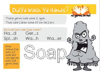 No germs on me word game to encourage children to wash their hands.